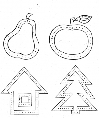 2) обводка контуров изображений (рисование по контурам): обведи рисунок точно по линиям, не отрывая карандаш (фломастер) от бумаги; копирование рисунков с помощью копировальной бумаги.
